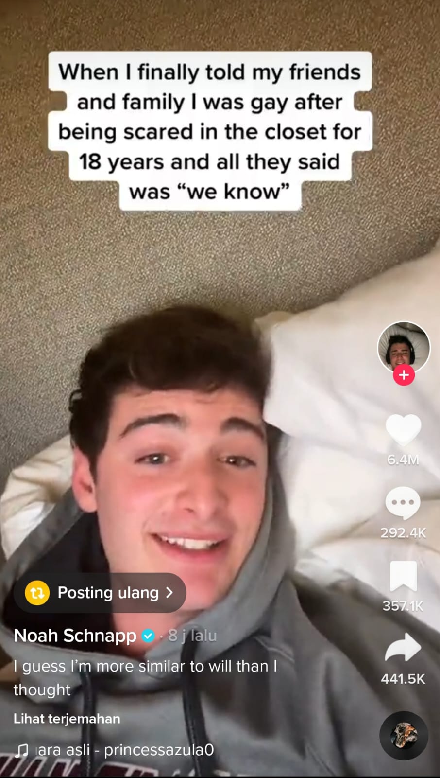 "Ketika saya akhirnya memberi tahu teman dan keluarga saya bahwa saya gay usai merasa takut selama 18 tahun dan yang mereka katakan hanyalah 'kami tahu'," tulis Schnapp di TikTok pada Jumat (6/1/2023).