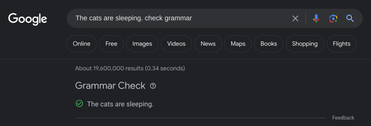 Google juga menyediakan fitur Feedback di bagian bawah hasil koreksi grammar, untuk memberikan masukan jika revisi yang dihasilkan tidak sesuai dengan kemampuan pengguna. Selain itu, perlu diingat bahwa cek grammar tidak berfungsi apabila pengguna melanggar kebijakan Google Search.