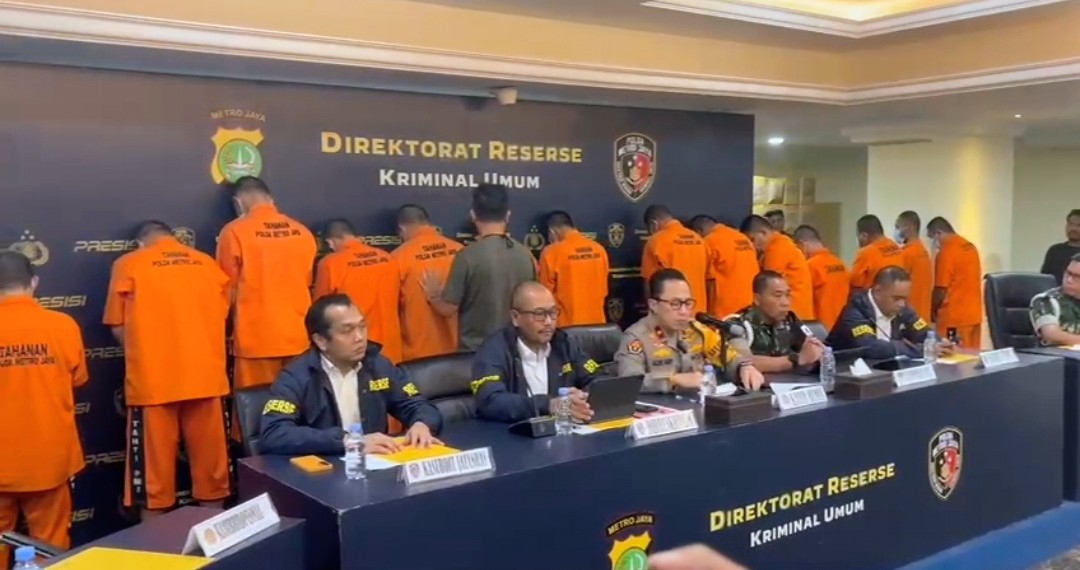 Pantauan di lokasi, para pelaku dihadirkan saat sesi konferensi pers di Aula Satya Haprabu Gedung Ditreskrimum Polda Metro Jaya, Selasa (16/9/2025). Tampak para pelaku yang dihadirkan berjumlah 15 pelaku.