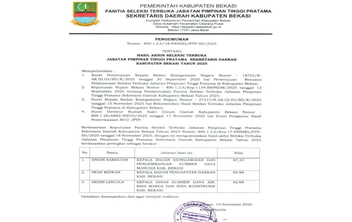 Pengumuman hasil seleksi terbuka ini ditandatangani Ketua Panitia Seleksi Mohammad Mulyadi tertanggal 19 November 2025.